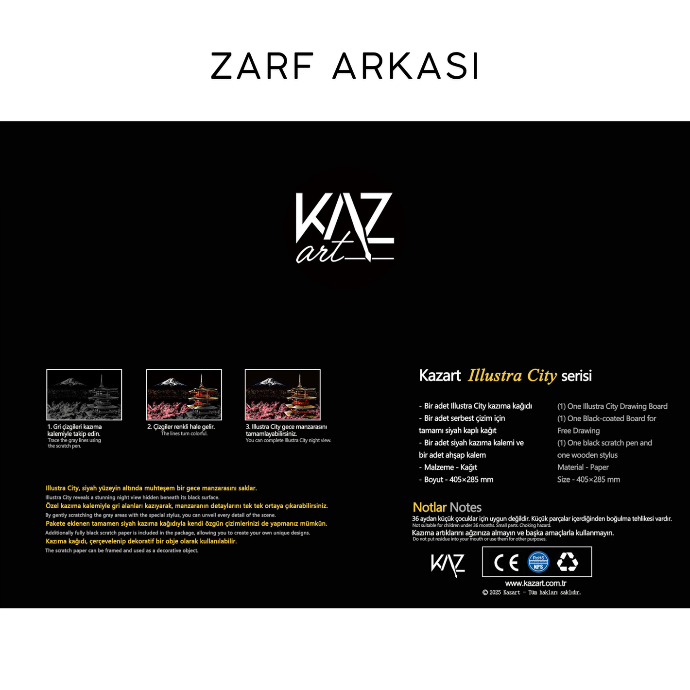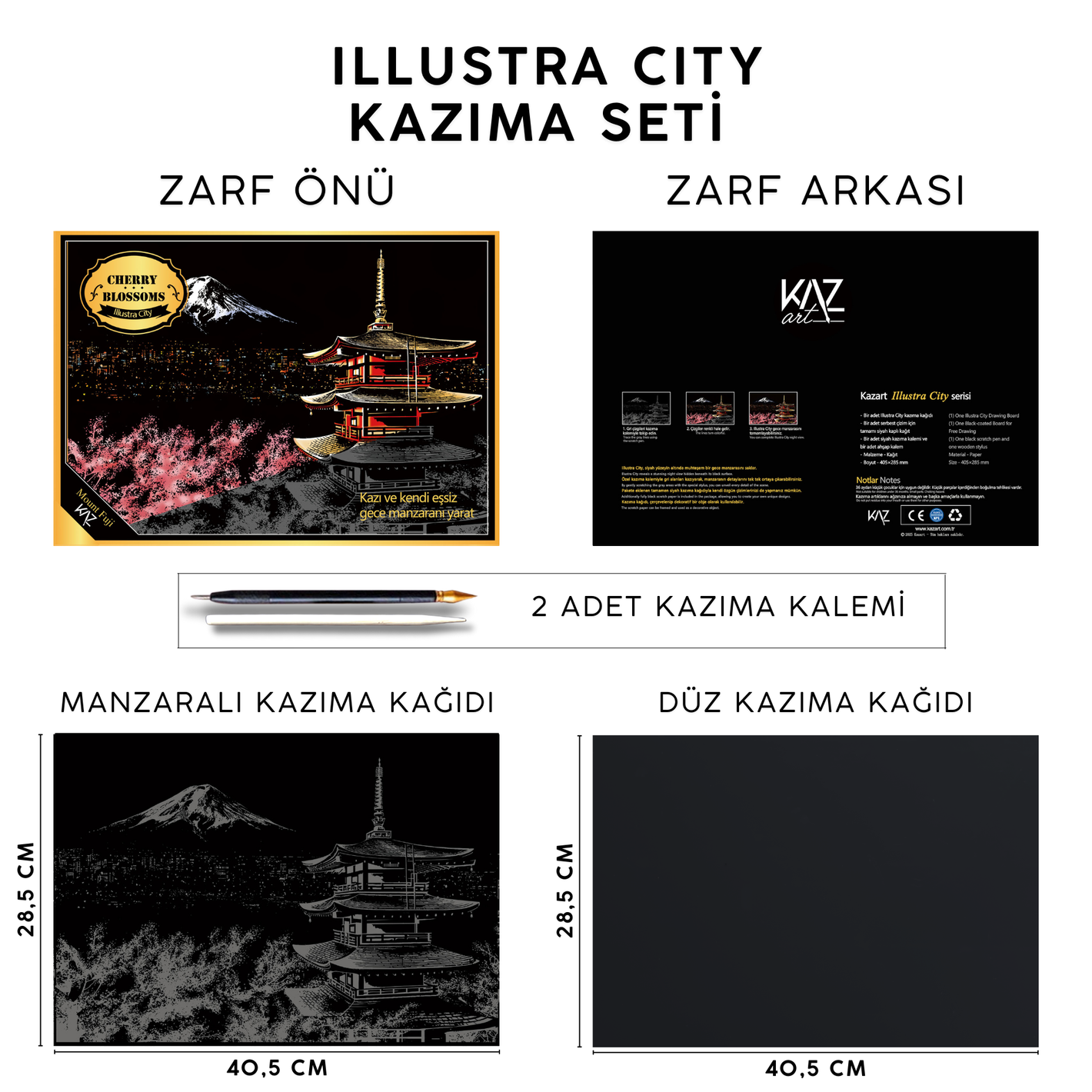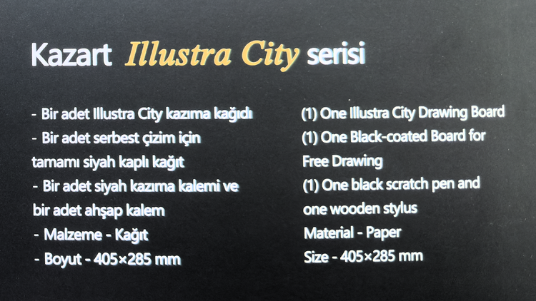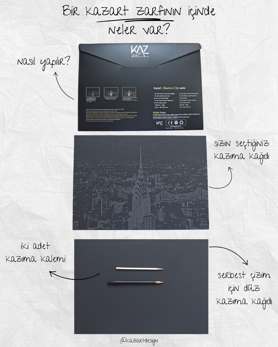 Illustra City ve Miras Koleksiyonlarında Her Setin İçinde; 2 adet kazıma kalemi, seçtiğiniz 1 adet kazıma kağıdı ve 1 adet manzarasız, serbest çizim yapabileceğiniz düz kazıma kağıdından bulunur.